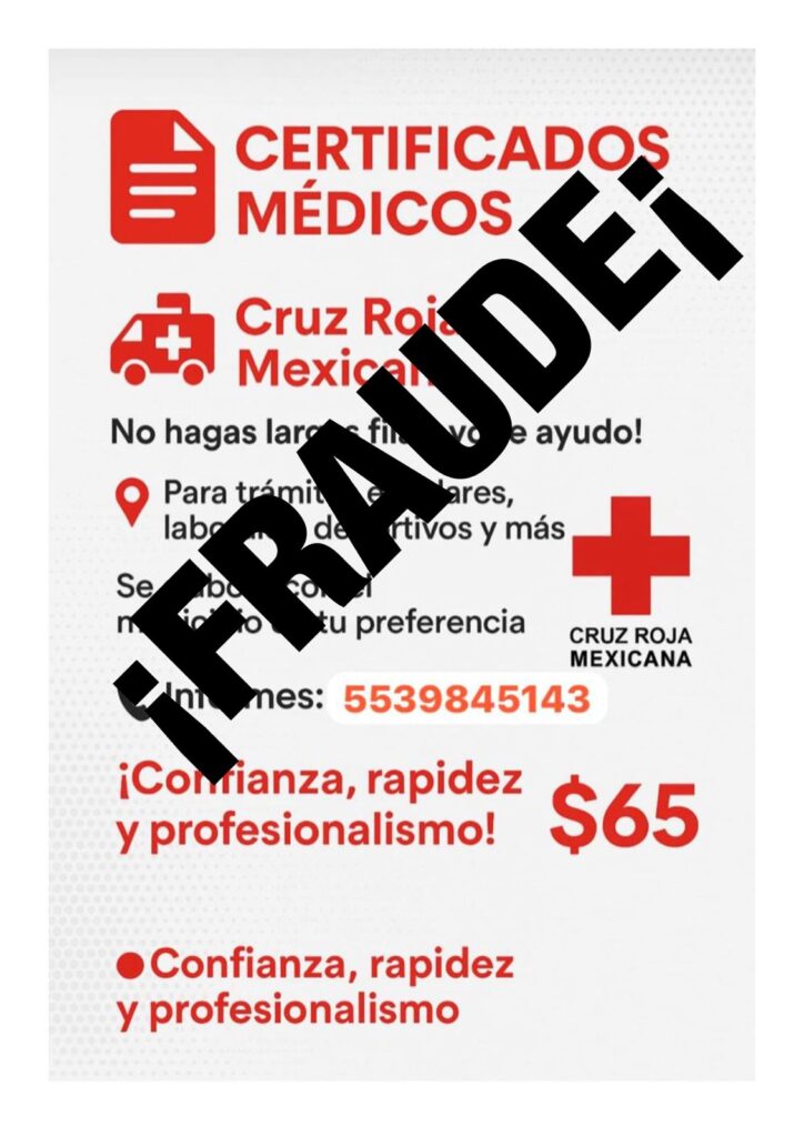 TOLUCA, México, 6 de Agosto de 2025.- Cruz Roja Mexicana, Delegación Estado de México, alerta que en internet, a través de páginas apócrifas y cuentas en redes sociales, personas sin escrúpulos ofrecen supuestos “certificados médicos”, a cambio de una cantidad de dinero, haciendo transferencias bancarias y únicamente enviando los datos personales (nombre, edad, peso corporal, estatura) de la persona que a la que se expedirá el documento.