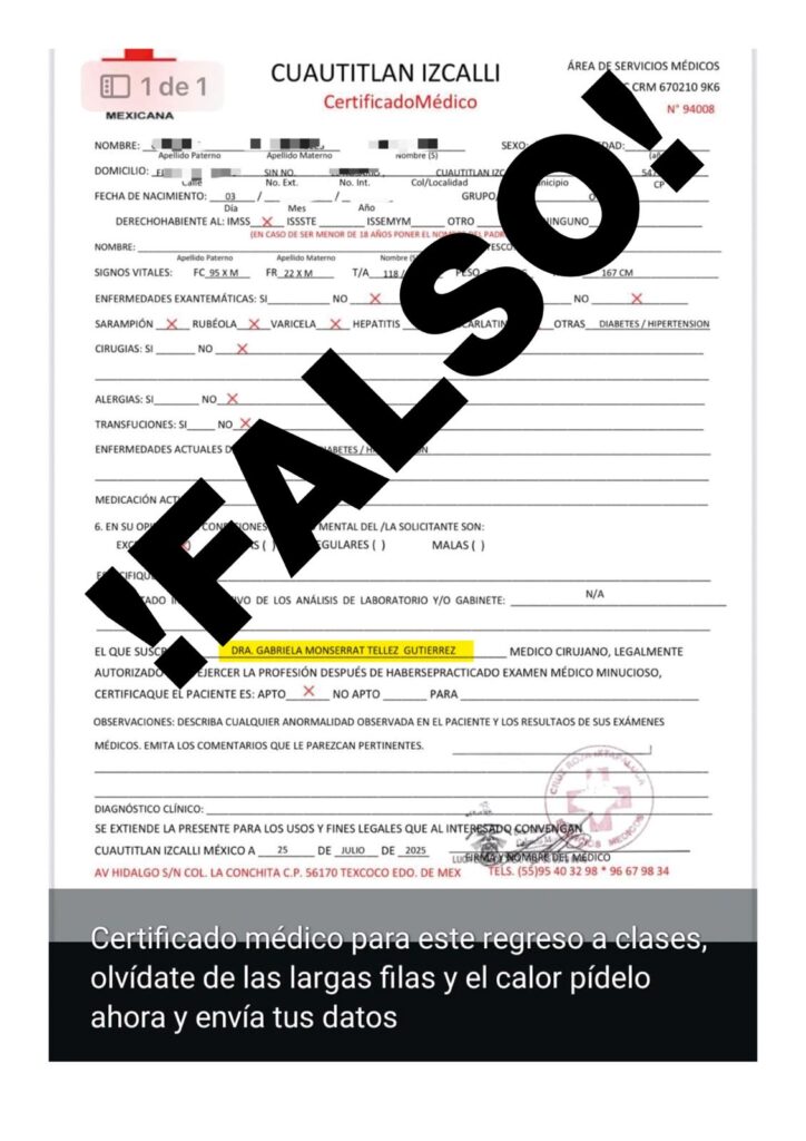 Realizar cualquier trámite en alguna dependencia o empresa con un “certificado médico” apócrifo obtenido a través de redes sociales o páginas de internet representa un fraude y puede poner en riesgo la salud y la vida de nuestros seres queridos, sobre todo en menores de edad. ¡No te dejes engañar!