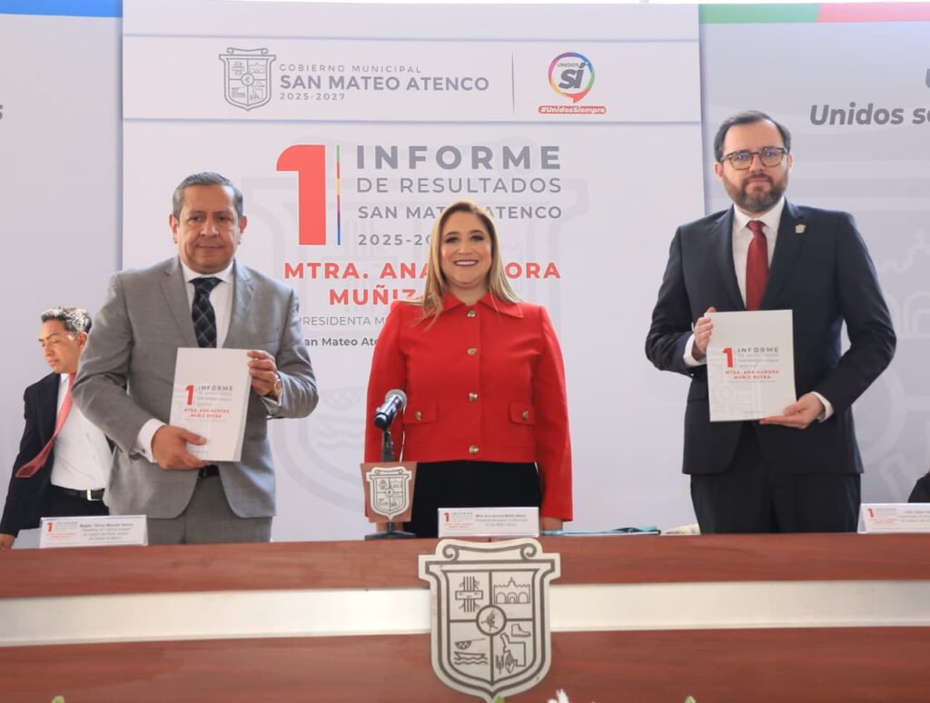 SAN MATEO ATENCO, México, 1 de Diciembre de 2025.- Vivir en democracia significa respetar la pluralidad, a quienes piensan distinto,, tener la capacidad de construir equilibrios y acuerdos, poniendo como eje de nuestros ideales la justicia social, expresó Ana Aurora Muñiz Neyra, presidenta municipal de San Mateo Atenco, al rendir su primer informe de gobierno en su segunda oportunidad como alcaldesa.